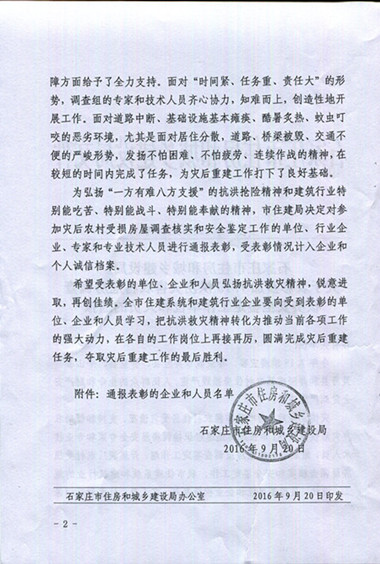 我公司员工康志平参加7.19洪涝灾害农村危房调查核实安全鉴定工作受到石家庄市住房和城乡建设局表彰…