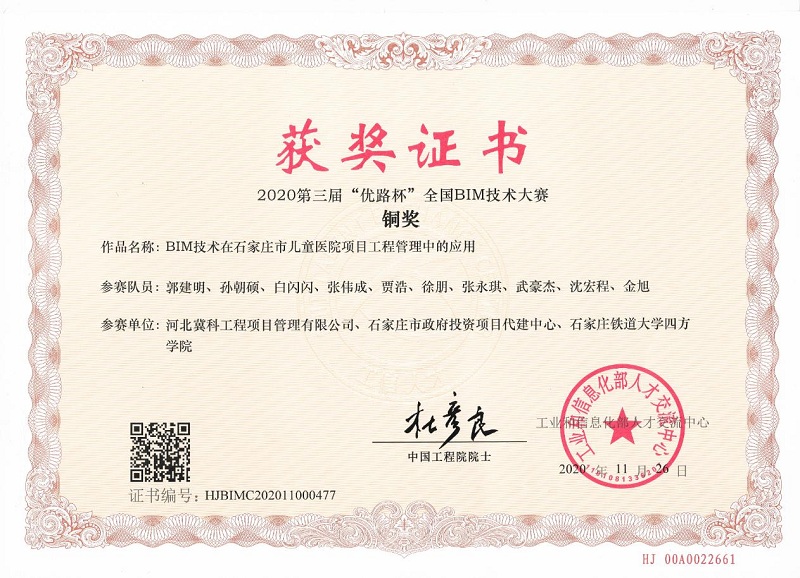 冀科公司荣获2020年第三届“优路杯”全国BIM技术大赛铜奖