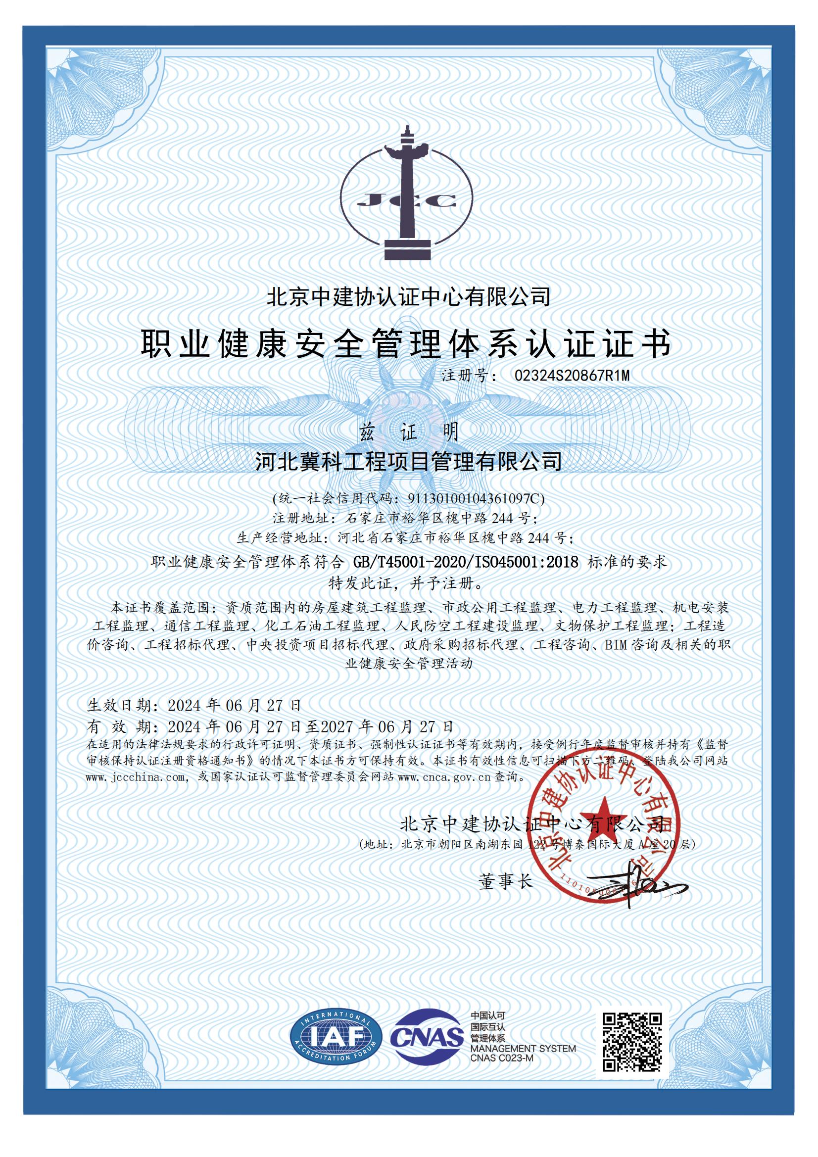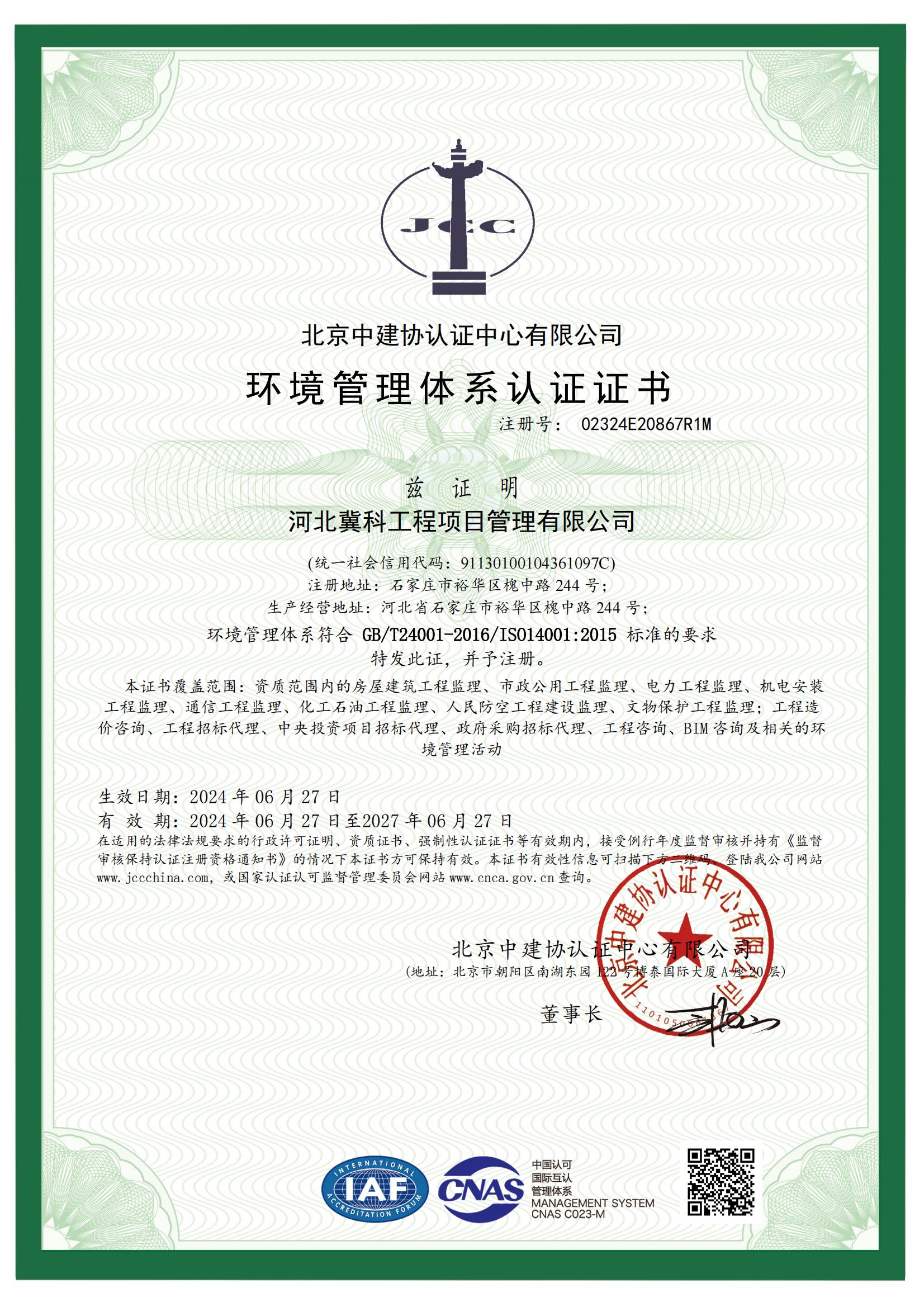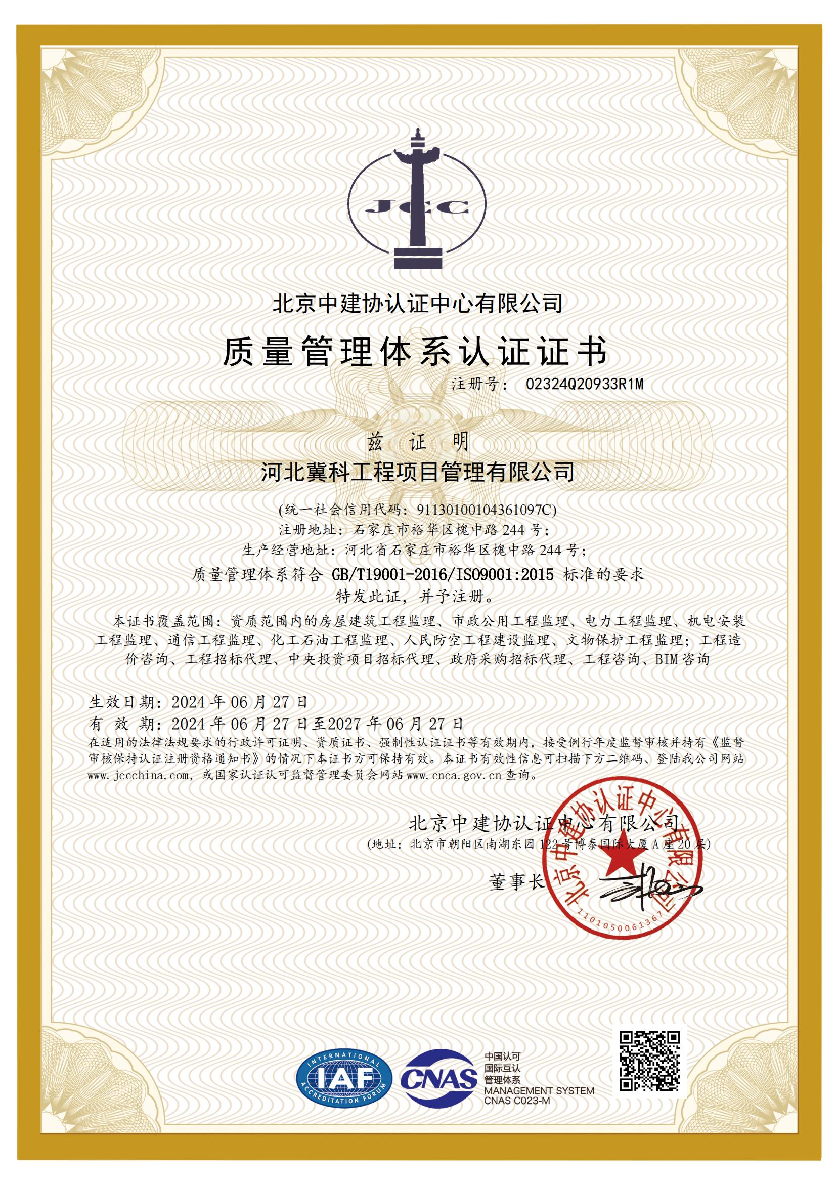 公司于2024年6月27日通过了质量、环境、职业健康安全管理体系认证。 工作中坚持“科学公正、守法诚信、追求卓越、专注品质,营造绿色环境、推进节能降耗,关注健康安全、持续预防改进,创建业内一流项目管理企业”的管理方针,不断打造具有公信力的名牌工程项目管理企业。