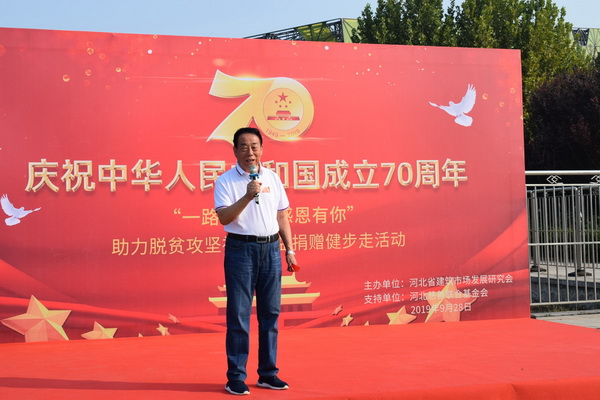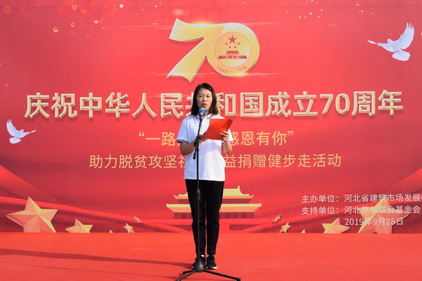 穆彩霞同志代表河北省建筑市场发展研究会向参与此次脱贫攻坚捐赠活动的爱心企业和爱心人士表示衷心地感谢。与此同时她介绍 “一路走来,感恩有你”助力脱贫攻坚社会公益捐赠及健步走活动基本情况,强调指出此次活动是配合河北省住房和城乡建设厅,联合河北慈善联合基金会共同开展庆祝中华人民共和国成立70周年,“一路走来,感恩有你 ”助力脱贫攻坚社会公益捐赠及健步走活动。本次活动旨在联合社会各界爱心人士共同解决保定市阜平县史家寨村村民的饮水问题。