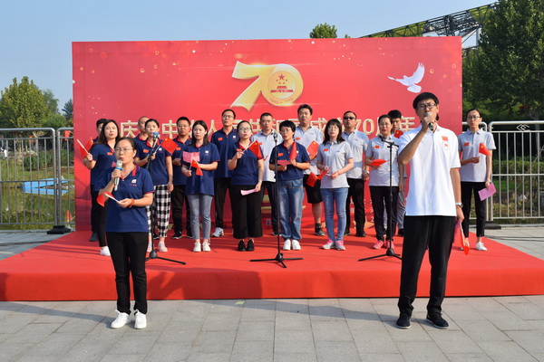 随后,由冀科公司周益文领唱,参加健步走的全体人员合唱歌曲《我和我的祖国》,共同唱出对祖国的爱国情怀。