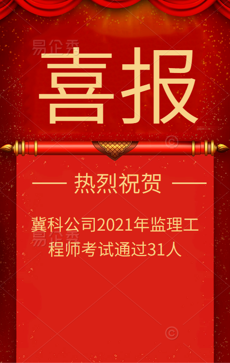 在冀科公司可持续发展人才战略的指引下,2021年全国注册监理工程师考试通过31人。加强企业人才队伍建设,持续提高技术管理水平是企业创新发展的动力。冀科公司将一如既往营造主动学习的良好氛围,打造学习型团队,提升企业专业水准,实现企业和员工的协同发展,为社会创造更大的价值。